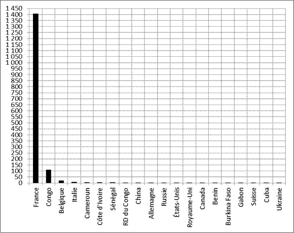 Vingt-deux références proviennent de sept pays africains suivants : - le Cameroun (5 soit 0,31 %) ; - la Côte d’Ivoire (5 soit 0,31%) ; - le Sénégal (5 soit 0,31%) ; - la République démocratique du Congo (4 soit 0,25%) ; - le Benin (1 soit 0,06%) ; - le Burkina Faso (1 soit 0,06%) ; - le Gabon (1 soit 0,06%).